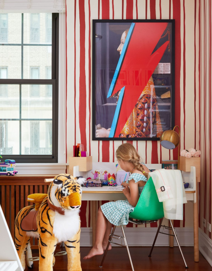 For school-aged kids like James and Stella, it helps to divide the room into “zones”: a cozy spot for reading before bed, a desk area for homework or drawing, and space for play. Even in smaller rooms, defining areas helps kids feel like they truly own their space.